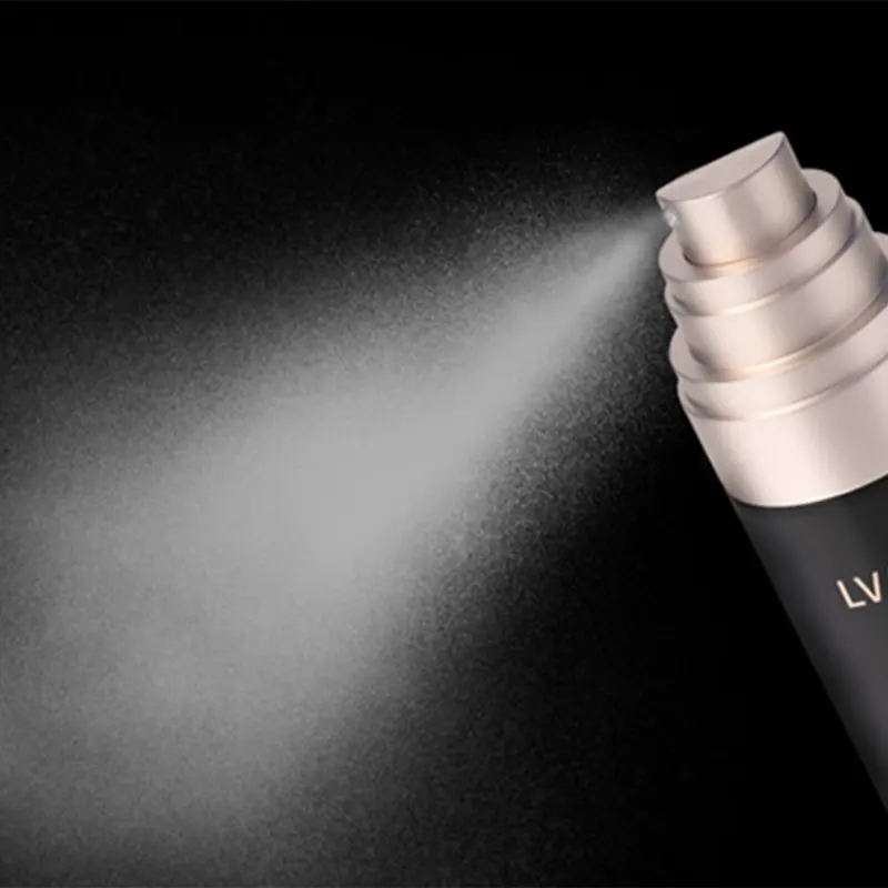 Nhắm mắt lại và miệng hoàn toàn, sau đó ấn mạnh vào máy bơm để làm mờ mặt trong khi giữ chai cách da 6 đến 10 inch.